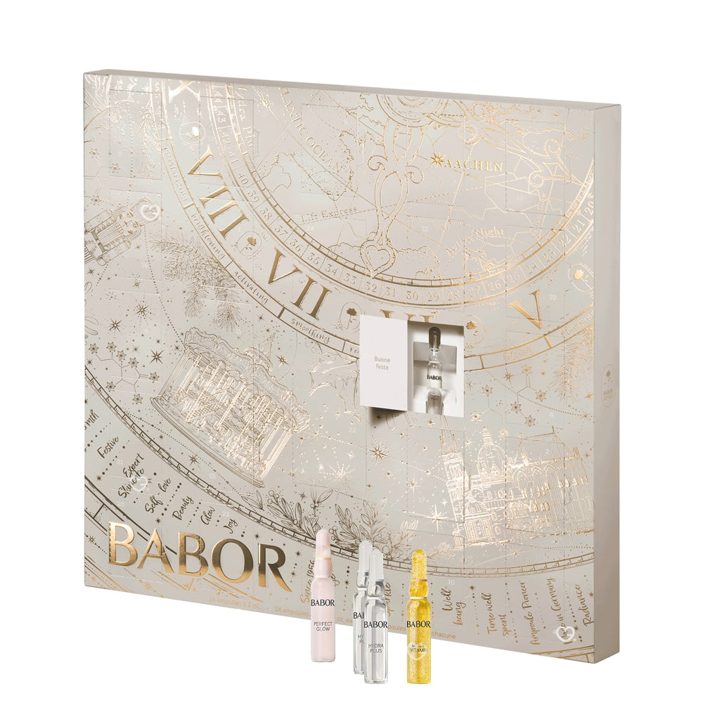 Calendrier de l’avent Babor 2025 : 24 concentrés d’actifs parfaitement coordonnés dans le calendrier de l’Avent exclusif BABOR 2025 . Le soin complet aux ingrédients précieux procure une sensation inoubliable sur la peau. Pour une peau radieuse , d’apparence jeune et un teint détendu pour la période de Noël. Collection de 24 ampoules préparées par des experts, conçues pour maximiser les résultats cutanés ! Offrez-vous une part de joie chaque jour en ouvrant ce calendrier de l’Avent Beauté glamour et découvrez un pouvoir beauté exclusif qui vous attend derrière 24 portes. Avec une peau éclatante et une sensation cutanée incomparable, plus rien ne s’oppose aux plus beaux jours de l’année. Préparez votre peau pour un Noël 2025 tout en beauté ! 24 concentrés actifs parfaitement adaptés les uns aux autres dans le calendrier Beauté BABOR. Cette cure complète et ses précieux ingrédients laissent une sensation inoubliable sur la peau. Pour une peau éclatante de beauté et de jeunesse, pour un teint reposé pour les fêtes de Noël Grâce à ses formules actives ultra concentrées, la cure d’ampoules revitalise, hydrate et régénère la peau pour les fêtes Secouer l’ampoule et recouvrir l’extrémité avec l’ouvre-ampoule joint. Casser d’un mouvement sec vers l’arrière au niveau de l’anneau de couleur. Verser le concentré dans le creux de la main, puis appliquer sur le visage, le cou et le décolleté => Découvrez le contenu complet du calendrier dans l’onglet CONTENU DETAILLÉ A qui s’adresse ce calendrier de l’Avent Babor ? Le calendrier de l’Avent Babor est idéal pour tous ceux qui souhaitent profiter de l’Avent pour réaliser une cure intense et bénéfique pour leur visage. Reconnue depuis 1956 pour ses formules de soin visage à base d ‘huile essentielles , la marque vous propose dans ce coffret beauté 24 jours, 24 ampoules , pour nettoyer, nourrir, protéger vos peaux. La précision scientifique des formules élaborée par Babor permet de vous garantir des soins en profondeur pour régénérer à votre visage et lui donner un second souffle. Ce calendrier de l’avent beauté est une occasion rêvée de mettre en place une routine beauté planifiée et conçut par des experts . Quelle est la valeur du contenu de ce coffret 2025 ? Le montant des soins cosmétiques contenus dans ce calendrier de l’Avent beauté a une valeur non communiquée Acheter au meilleur prix : Comparer et acheter ce calendrier au meilleur prix dans l’un de ces e-shop : Allbeauty Amazon Code promotion Babor : Aucun code promotion disponible pour le moment Retrouvez tous les calendriers de l’Avent en promotion . Date de sortie du Calendrier de l’Avent 2025 : Le calendrier de l’Avent Babor est disponible début octobre sur le amazon et allbeauty