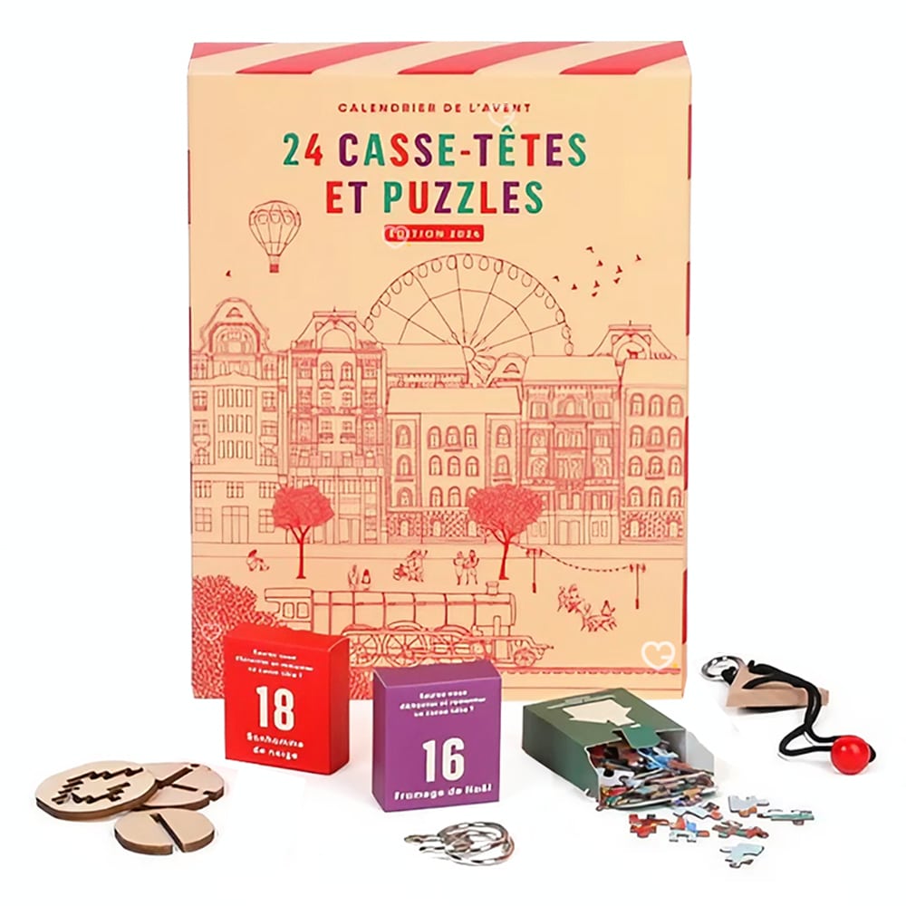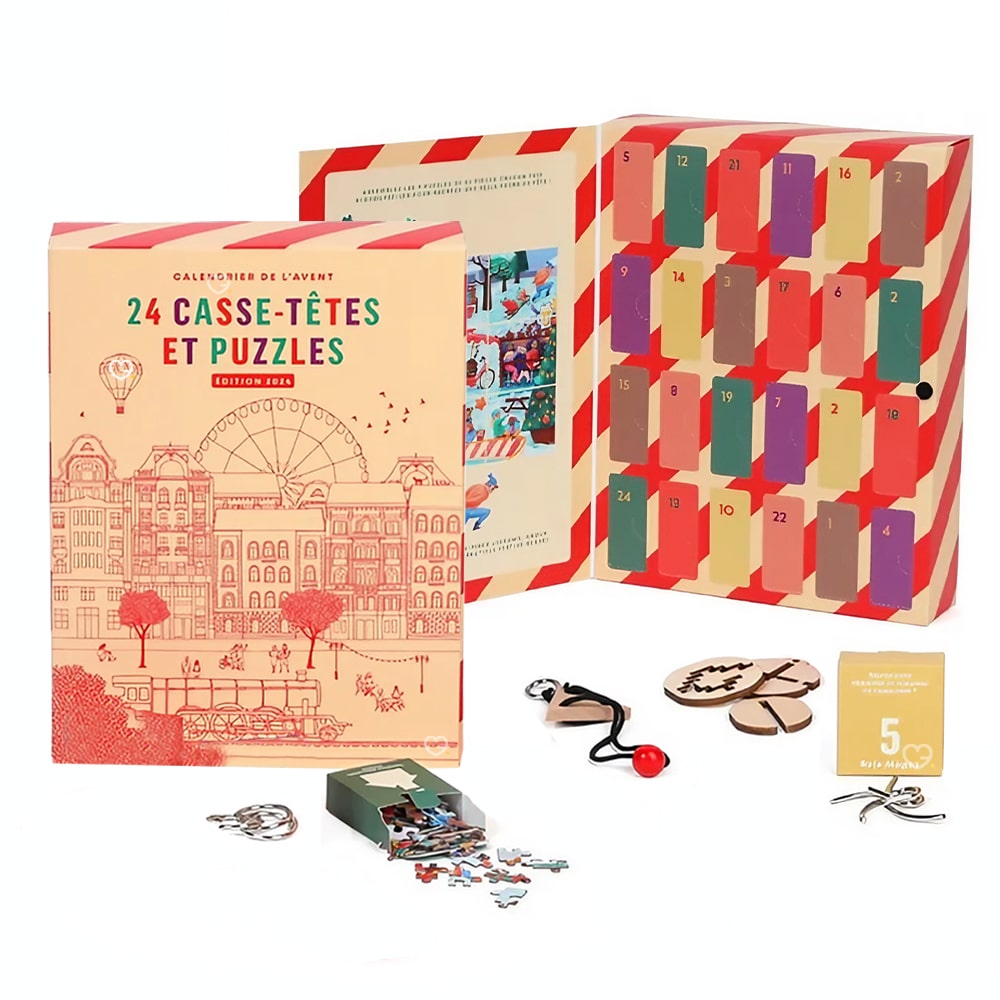 Calendrier de l’avent Casse-Têtes Nature et Découvertes 2025 : En quête d’originalité et envie de challenge ? Découvrez le calendrier de l’avent original signé par Nature et Découvertes ! Dans ce coffret, vous allez découvrir 24 casse-têtes différents ! Chaque jour, tester votre logique et votre sens de l’observation avec des puzzles , des casses en métal ou tangram Comme il y a plusieurs niveau de difficultés, cela vous laissera du temps pour ouvrir la prochaine case de votre calendrier. Un calendrier de l’avent qui va vous donner du fils à retorde ! En avant les méninges ! Les points clefs du calendrier : LUDIQUE : Un compte à rebours ludique et stimulant : chaque jour un nouveau défi à relever avec un casse-tête original sur le thème de Noël. De quoi patienter intelligemment jusqu’au 25 décembre ! VARIÉS : Des casse-têtes variés pour tous les goûts : Puzzles, tangrams, énigmes en bois ou en métal… il y en a pour tous les âges et tous les niveaux. Petits et grands pourront s’amuser et faire travailler leurs méninges. CONVIVIAL : Pour s’amuser en famille ou entre amis : Partager un moment en famille ou entre ami et défiez vous pour savir qui sera le plus rapide. CADEAU : Une excellente idée cadeau : Offrez ce calendrier original aux fans de jeux de logique, il fera un très beau cadeau de Noël à déballer en avance. La qualité Nature & Découvertes est au rendez-vous. REFLEXION : Pour résoudre l’énigme, il faudra faire preuve de sens de l’observation, de logique… et de patience ! APPRENTISSAGE : Besoin d’aide ? les solutions sont inclut dans ce calendrier de l’avent puzzle Que contient ce coffret ? Ce calendrier de l’avent nature et découvertes contient 24 casse-têtes pour enfants et adultes dont : 9 puzzles représentant des scènes festives 1 tangram 8 casse-têtes en métal 6 casse-têtes en bois => Découvrez le contenu complet du calendrier dans l’onglet CONTENU DETAILLÉ A qui s’adresse le calendrier casse-tête ? Si vous êtes du genre à aimer les enigmes , résoudre des mystères, les jeux découvertes ou puzzle.. Ce calendrier de l’Avent casse-tête va vous passionner ! Chaque jour vous trouverez dans ce coffret Nature et Découvertes un casse-tête métallique. Ces différents niveaux de difficulté lui permettent de se surpasser et nous pousser dans nos limites . Pour adulte ou enfant , pour soi même ou en défi, tout le monde peut participer et tenter de libérer ses pièces. Qui sera le meilleur ? Le mieux est de s’entrainer. Bons plans et code promotion Nature et Découvertes : Aucun code promo n’est disponible sur ce calendrier de l’Avent pour l’instant Retrouvez ici tous les calendriers de l’avent en promotion Informations pratiques : Date de sortie : Ce calendrier de l’Avent vins sera disponible sur le site natureetdecouvertes.com début Octobre Frais de port : Livraison gratuite à partir de 49€ d’achat Click’n Collect : prêt en 1 heure Retour gratuit 30 jours