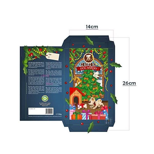 Le calendrier de l’Avent pour chien Hov-Hov 2025 contient : Un calendrier de l’Avent pour chien avec friandises en ingrédients de qualité – 100% naturel 150 g de friandises pour chien de grande qualité avec 30% de viande de gibier 100% naturel – sans produit chimique Sain – avec carottes et huile de coco, sans sucre. Fabriqué à la main – dans une petite manufacture l’UE Dimensions : 14 x 26 cm, Composition : Farine e seigle, farine de blé, gibier 30%, oeuf, carotte et huile de coco. => Découvrez le contenu complet du calendrier dans l’onglet CONTENU DETAILLÉ