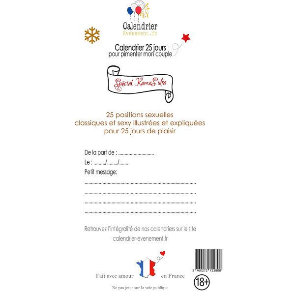 Calendrier de l’avent Kamasutra : Calendrier de l’avent sexy pour couple revisité en kamasutra. Cadeau idéal pour homme et femme pour toute l’année à offrir ou à s’offrir en toute occasion. Il vous permettra de connaitre les positions sexuelles les plus simples et les plus sexy pour pimenter votre couple. 25 jours pour expérimenter de nouvelles techniques assez simples, grâce à ce calendrier Kamasutra. KAMASUTRAS illustré – Calendrier images SEXY couple – cadeau homme femme – 25 jours pour pimenter son couple – kamasutra Cadeau Noel saint valentin anniversaire original et insolite 25 DEFIS couple Kama sutra illustré Calendrier de l’avent adulte fabriqué à la main en France – série limitée Illustré par LE LABO – Papier cartonné de qualité => Découvrez le contenu complet du calendrier dans l’onglet CONTENU DETAILLÉ Code promotion : Aucun code promo n’est disponible sur ce calendrier de l’Avent pour l’instant Retrouvez ici tous les calendriers de l’avent en promotion
