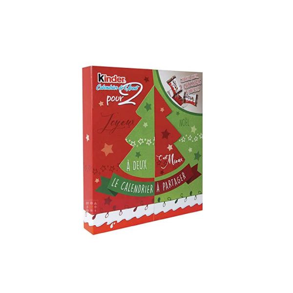 Calendrier de l’avent KINDER à Partager : Le calendrier de l’Avent Kinder pour deux est composé d’un assortiment bonbons chocolat et fines gaufrettes à partager ! Mini; Country; Bueno… Ce coffret à partager sera combler petits et les grands enfants pendant 24 jours. Prêt pour découvrir de délicieux chocolats Kinder ? Avec ce calendrier duo de Kinder, c’est chacun·e son chocolat tout au long du mois de décembre. Tout le monde est ainsi comblé, puisque les cases renferment deux gourmandises. Bien pensé et toujours aussi délicieux ! => Découvrez le contenu complet du calendrier dans l’onglet CONTENU DETAILLÉ A qui s’adresse le calendrier Kinder à partager ? Le calendrier de l’Avent Kinder à partager s’adresse à tous ceux qui l’année dernière se sont fait subtiliser un chocolat de leur coffret chocolat ou à tous ceux qui souhaitent passer le décompte de l’Avent en dégustant à deux un bon chocolat. Avec son contenu varié et ses références favorites, le calendrier Kinder va vous combler de moment chocolaté, sans dispute, sans compris, dans la joie et la bonne humeur. Plus de calendrier dans le même thème ? Vous souhaitez voir d’autres calendriers de cette marque ? Retrouvez ici tous les calendrier de l’Avent KINDER