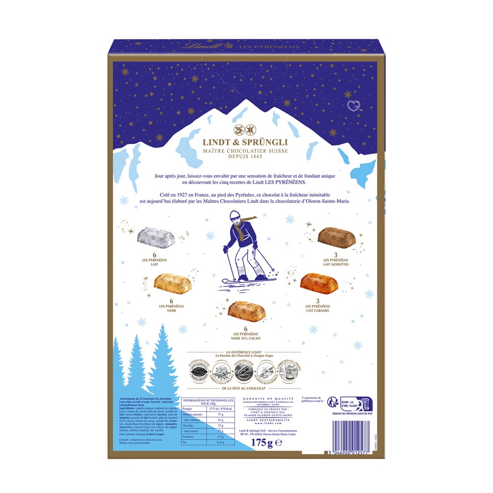 Calendrier de l’Avent Chocolat Les Pyrénéens : De la fraicheur et du chocolat ! Savourez votre décompte avec le calendrier de l’Avent Les Pyrénéens et ses 24 chocolats. Au travers 5 recettes uniques et délicieuses, Lindt vous propose une dégustation fraiche et gourmande avec un assortiment fondant de chocolats au lait et noirs : Lait, Noir, Noir 70%, Lait Caramel et Lait Noisettes . Un concentré de gourmandise et de qualité supérieure fabriqué en France, pour une explosion de saveurs à chaque case ouverte. Lindt s’engage aussi pour un cacao 100% traçable et durable. 175g de pur plaisir à s’offrir ou à partager ! Contenu et valeur de ce calendrier de l’Avent ? Le calendrier de l’Avent Pyrénéens contient 24 délicieux chocolats avec un assortiment de 5 recettes différentes : Au total ce coffret contient : 6 Pyrénéens Lait 6 Pyrénéens Noir 6 Pyrénéens Noir 70% 3 Pyrénéens Lait Caramel 3 Pyrénéens Lait Noisettes => Découvrez le contenu complet du calendrier dans l’onglet CONTENU DÉTAILLÉ A propos de Lindt Les Pyrénéens : C’est en 1927, au cœur des Pyrénées françaises, que débute l’histoire de la marque Les Pyrénéens de Lindt. Créée par Maurice Rozan de Mazilly, la chocolaterie s’établit à Oloron-Sainte-Marie (64) avec une ambition : élaborer des chocolats d’une fraîcheur et d’une finesse inégalées, grâce au savoir-faire unique de ses Maîtres Chocolatiers. Près d’un siècle plus tard, Lindt perpétue cet héritage d’excellence en proposant une gamme de chocolats au lait et noirs extra-fins, fourrés d’un délicat cœur fondant, pour des moments de dégustation d’exception. Bons plans et code promotion Lindt : Code promotion provisoire : Promotion en cours sur le calendrier : -25% pas besoin de code promo Retrouvez tous les calendriers de l’Avent en promotion . Informations Complémentaire : Date de sortie : Le calendrier Avent Lindt Les pyrénéens est généralement disponible début septembre sur le site amazon.fr