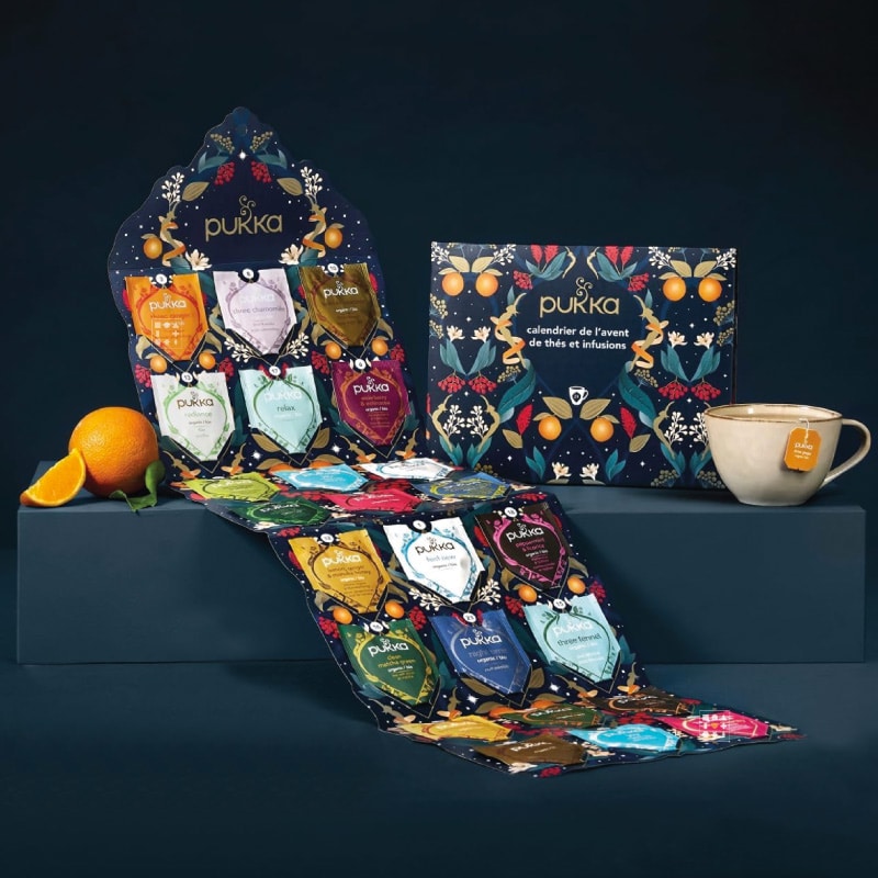 Calendrier de l’Avent Pukka 2025 : Chaque calendrier de l’avent Pukka contient une sélection de 24 des mélanges préférés pour remonter le moral, se réchauffer ou se apporter la calme: Citron, gingembre et miel de Manuka ou encore Thé vert matcha ginseng et Trois réglisses Inspiré par les magnifiques boîtes de thé et infusion Pukka, ce calendrier de l’Avent sans chocolat est la décoration de Noël ou le cadeau idéal pour tous les amateurs de thé Avec ce calendrier de l’Avent thé, célébrez la période festive avec du thé et des infusions à la place du chocolat 24 délicieux mélanges biologiques pour célébrer les fêtes de fin d’année 100% d’ingrédients issus de l’agriculture biologique et du commerce équitable. Végétarien, casher et sans OGM. Un cadeau pour vous et pour la planète : pour chaque calendrier de l’avent de Pukka, 1% des ventes seront consacrées à des causes environnementales Tous les emballages de ce calendrier sont recyclables et fabriqués à partir de ressources renouvelables => Découvrez le contenu complet du calendrier dans l’onglet CONTENU DETAILLÉ Les autres calendriers de l’Avent Pukka? La marque propose cette année 2 coffrets différents : Calendrier de l’Avent Pukka pour deux : 48 sachets de thés (34 euros) Calendrier de l’Avent Pukka 2025 à suspendre : 24 sachets de thés bio (15 euros) Calendrier de l’Avent Pukka 2022 à suspendre : 24 sachets de thés bio (14 euros) En savoir plus sur la marque Pukka : Pukka, dont le nom en hindi signifie « vrai, authentique ou original », est une marque qui incarne une passion pour les plantes et l’herboristerie . Fondée par Sebastian et Tim, cette entreprise a vu le jour à la suite d’une rencontre fortuite et d’une vision commune : promouvoir le pouvoir magique des plantes et les bienfaits holistiques de l’Ayurvéda. Sebastian, fasciné par les plantes, et Tim, avec son expérience en changement organisationnel, ont uni leurs forces pour créer des infusions délicieuses et bénéfiques. Pukka Herbs a été officiellement fondée fin 2001, et depuis, elle s’est engagée à offrir des produits de qualité , tout en mettant l’accent sur la durabilité , l’éthique et la conservation. Avec une gamme de produits allant des tisanes aux compléments alimentaires, Pukka est devenue une référence dans le monde de la bien-être naturel . Code promotion : Promotion Pukka : Aucun code promo disponible pour le moment. Retrouvez tous les calendriers de l’Avent en promotion