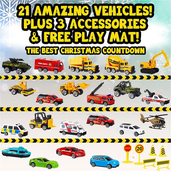 Calendrier de l’avent Voitures d’intervertion 2025 : POUR FAIRE PATIENTER LES ENFANTS JUSQU’À NOËL — ouvrez chaque jour une petite fenêtre de ce calendrier de lavent enfant Action City pour découvrir une surprise adorable sur le thème de la ville CONTIENT 24 SURPRISES – contient surprises à découvrir: camion pompier, police, voiture, accessoire à ajouter à leur collection de petites voitures AVEC TAPIS DE JEU — pour créer des aventures extraordinaires dans la ville, ces calendriers de l’avent pour enfant sont livrés avec un tapis de jeu sur le côté POUR GARCON OU FILLE — chaque jouet de ce calendrier de l’avent jouet a été développé avec soin pour les jeunes enfants. Ce calendrier de l’avent 2021 enfant est composé de 24 accessoires variés IDÉE CADEAU POUR LES FANS DE PETITES VOITURES — à la recherche d’un calendrier de l’avent voiture ou figurine ? Ce calendrier de l’avent garçon ou fille est une super idée de cadeau pour les passionnés de voitures => Découvrez le contenu complet du calendrier dans l’onglet CONTENU DETAILLÉ Version disponible pour ce calendrier de l’Avent 2025 : Ce calendrier existe en plusieurs versions : Calendrier de l’Avent Véhicules de Construction Calendrier de l’Avent Voitures de Courses Calendrier de l’Avent Véhicules D’intervention