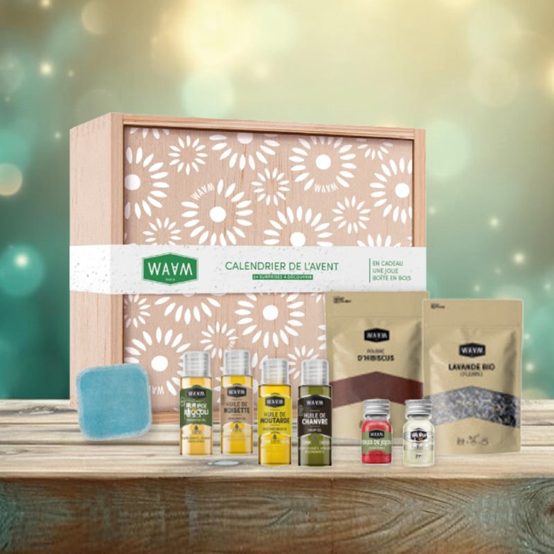 Calendrier de l’Avent WAAM : Présenté dans une jolie boîte en bois réutilisable, Waam revient avec un calendrier de l’avent beauté qui contient des produits et soins pour le visage, le corps ou les cheveux. Prônant toujours une beauté plus naturelle et plus responsable , la marque a intégré dans son coffret de quoi tester de nouveaux produits et faire de belles découvertes avec 20 produits, 2 accessoires mais aussi 2 surprises de la marque Venus & Gaïa et So’cup ! Chaque surprises peuvent être utilisés seuls ou dans des recettes DIY. Retrouvez toutes les utilisations possibles sur les fiches produits de chacun d’entre eux. De nombreuses recettes DIY sont également présentes sur le site WAAM. Ce coffret original est adapté à tous, même les plus débutants dans le DIY pourront facilement réaliser certaines recettes, ce qui en fait le cadeau parfait pour les adeptes de la cosmétique en général et toutes celles et ceux qui aiment les produits sains et naturels . Contenu et valeur de ce calendrier de l’Avent ? Le calendrier de l’Avent Waam 2025 contient 24 indispensables de la cosmétique DIY naturelles dont 2 surprises pour une valeur totale estimée de 150 euros Parmi les produits de ce coffret beauté vous découvrirez du dentifrice en poudre; de l’huile d’manade douce; un baume démaquillant ou encore un beurre de Karité Yuzu Au total, ce calendrier contient : 3 magic Powders (poudre magique) 6 huiles végétales 2 soins neutres 2 eaux florales 6 poudres et exfoliants 1 beurre 2 accessoires beauté 2 surprises exclusives => Découvrez le contenu complet du calendrier dans l’onglet CONTENU DÉTAILLÉ A qui s’adresse le calendrier Waam ? Le Calendrier de l’Avent Waam s’adresse à tous ceux qui souhaitent concevoir et réaliser eux même leur produit de beauté et de cosmétiques. La marque qui prône le respect de la Nature et du Vivant depuis 2016 a réalisé un coffret complet composé de produits sains et naturels indispensables pour vos recettes cosmétiques DIY : Argile; Huile de Carotte; Huile de Brocoli; Beurre de karité.. tout a été pensé pour vous offrir tout le nécessaire. Un calendrier de l’Avent DIY tendance et original qui répond aux attentes moderne en terme de bien-être et de beauté : prendre soin de soi de façon saine en préservant la nature. Où acheter ce calendrier de l’avent ? Comparer et acheter le calendrier de l’Avent Waam 2025 au meilleur prix sur : Waam Nature et Découvertes Code promotion Waam : Aucun code promo n’est disponible sur ce calendrier de l’Avent pour l’instant. Retrouvez tous les calendriers de l’Avent en promotion . Avantage Waam : Livraison offerte dès 45 euros d’achat Cadeau offert : 1 gant loofah offert à l’achat du calendrier de l’avent Code promotion : 10% de remise / inscription newsletter (non valable sur le calendrier) Date de sortie du Calendrier de l’Avent : Le calendrier de l’Avent WAAM 2025 est disponible sur waam.fr et natureetdecouvertes.fr